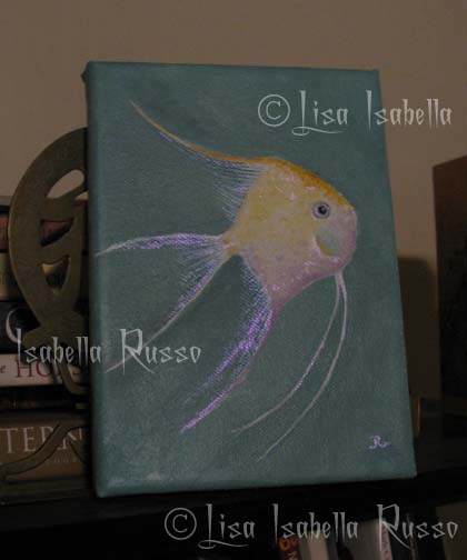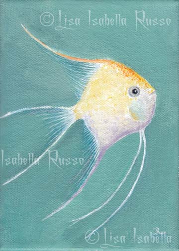 This angelfish is away from his school. He has accents of yellow orange and purple and a sweet gaze. I love fish, I think they are so lovely. This is a preliminary piece for a larger mermaid piece with this fish and some of his school friends here. I thought he made an excellent solo subject as well. The art style has a realist lowbrow feel.